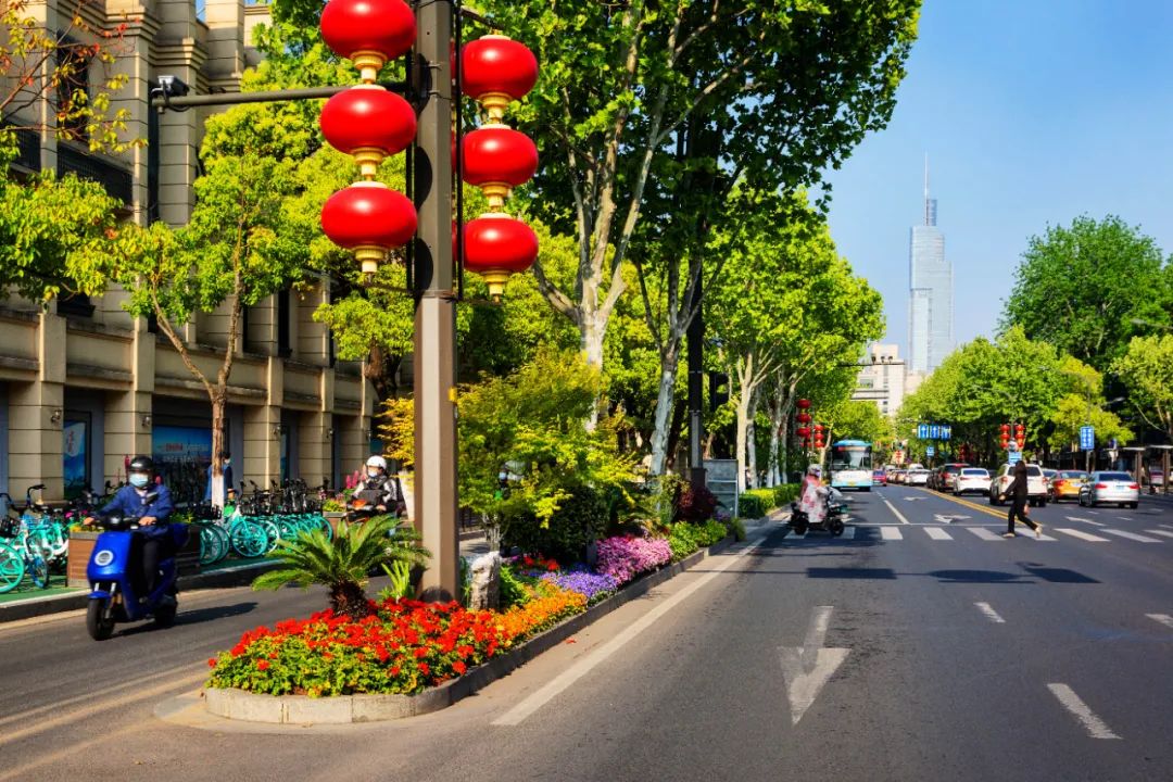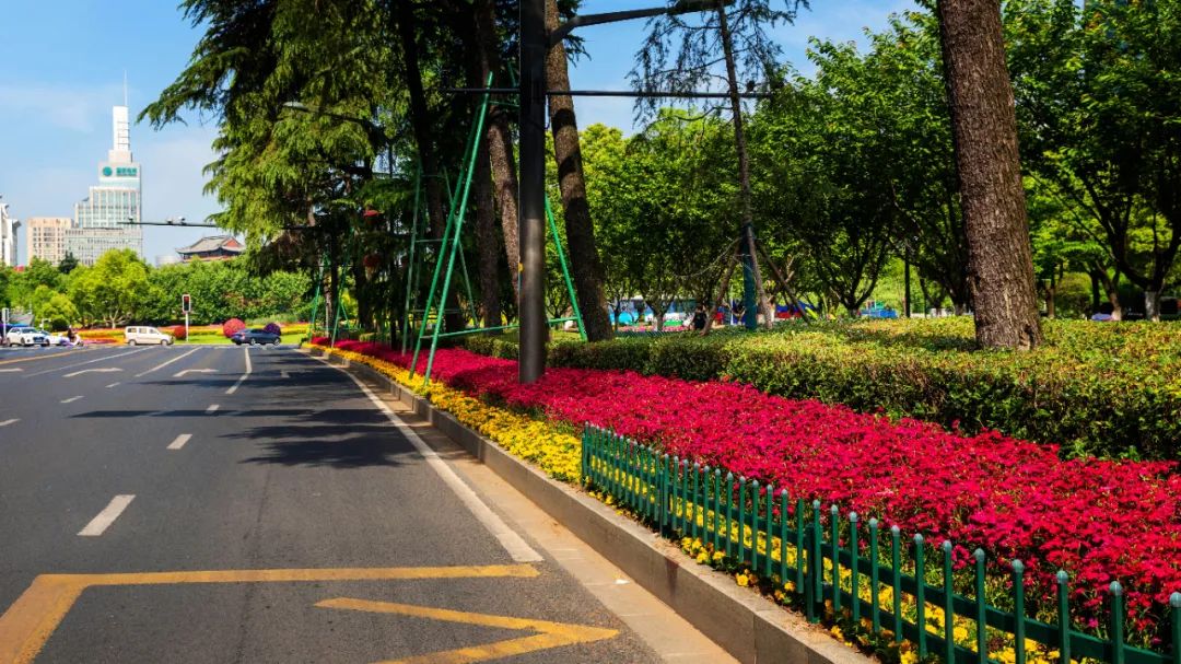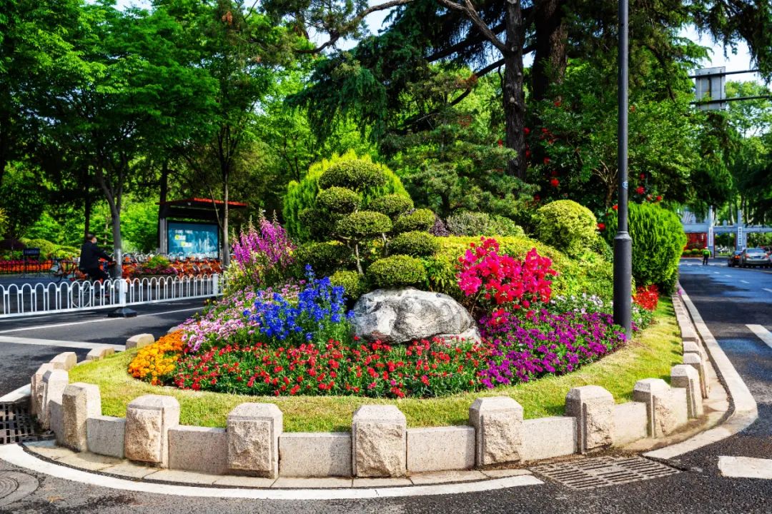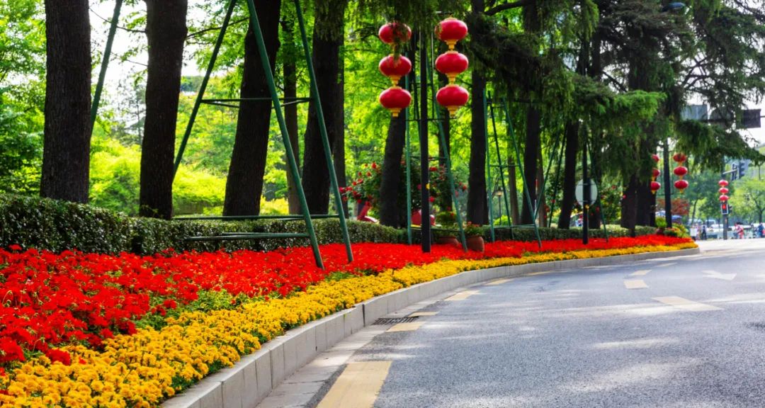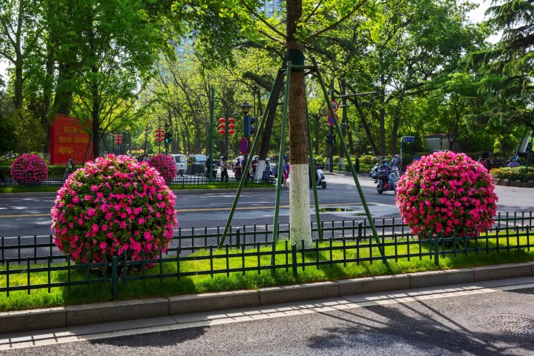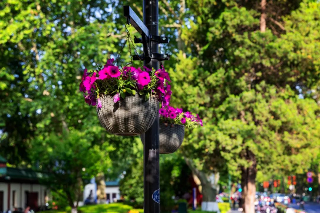 對市府門前路、長江路、九華山站、荔枝廣場、中山門城墻等重要節(jié)點容器花箱、花球、燈桿掛花及新街口東北角綠地進行花卉布置,選用朱蕉、羽扇豆、毛地黃、天竺葵、桑貝斯鳳仙、金雀、澳洲朱蕉、變?nèi)~木、四季海棠、鼠尾草、歐石竹、垂掛牽牛等花卉,以色彩鮮明、層次豐富的設(shè)計感,裝扮城市街角,營造濃厚的節(jié)日氣氛。