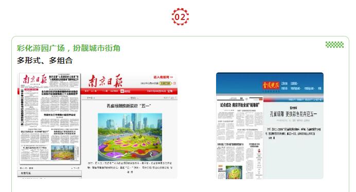 鼓樓中心廣場孔雀綠雕換上新妝、“五福梅花”和12個錯落的幸?;ㄇ蛞陨是逍碌幕ɑ懿贾?,營造出“‘梅’好金陵”的春天氣息。4月25日,《南京日報》、《金陵晚報》等多家媒體對鼓樓中心廣場孔雀綠雕迎五一換妝進行報道。