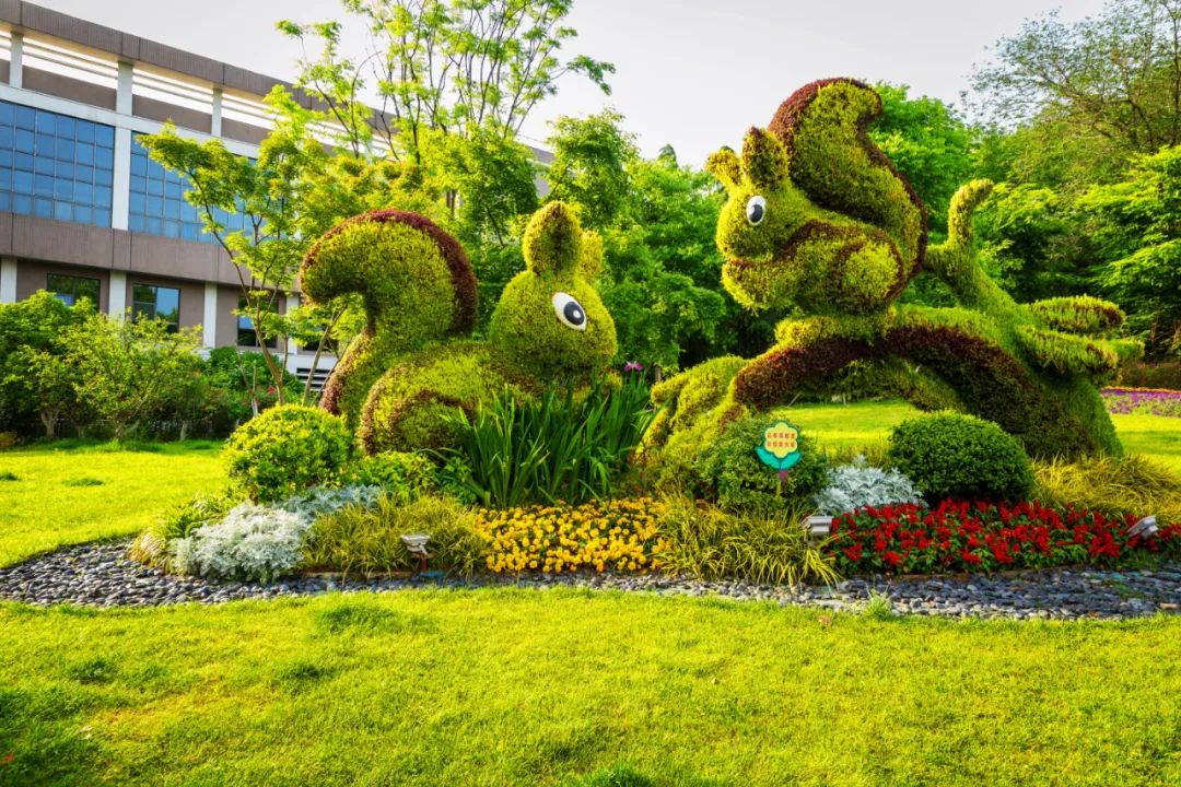 和平公園東園“幸福之門”、西園“飛躍之門”、九華山南坡松鼠等綠雕花境布置,花姿招展、層次錯落的空間感和情景變化,步移景異、栩栩如生。